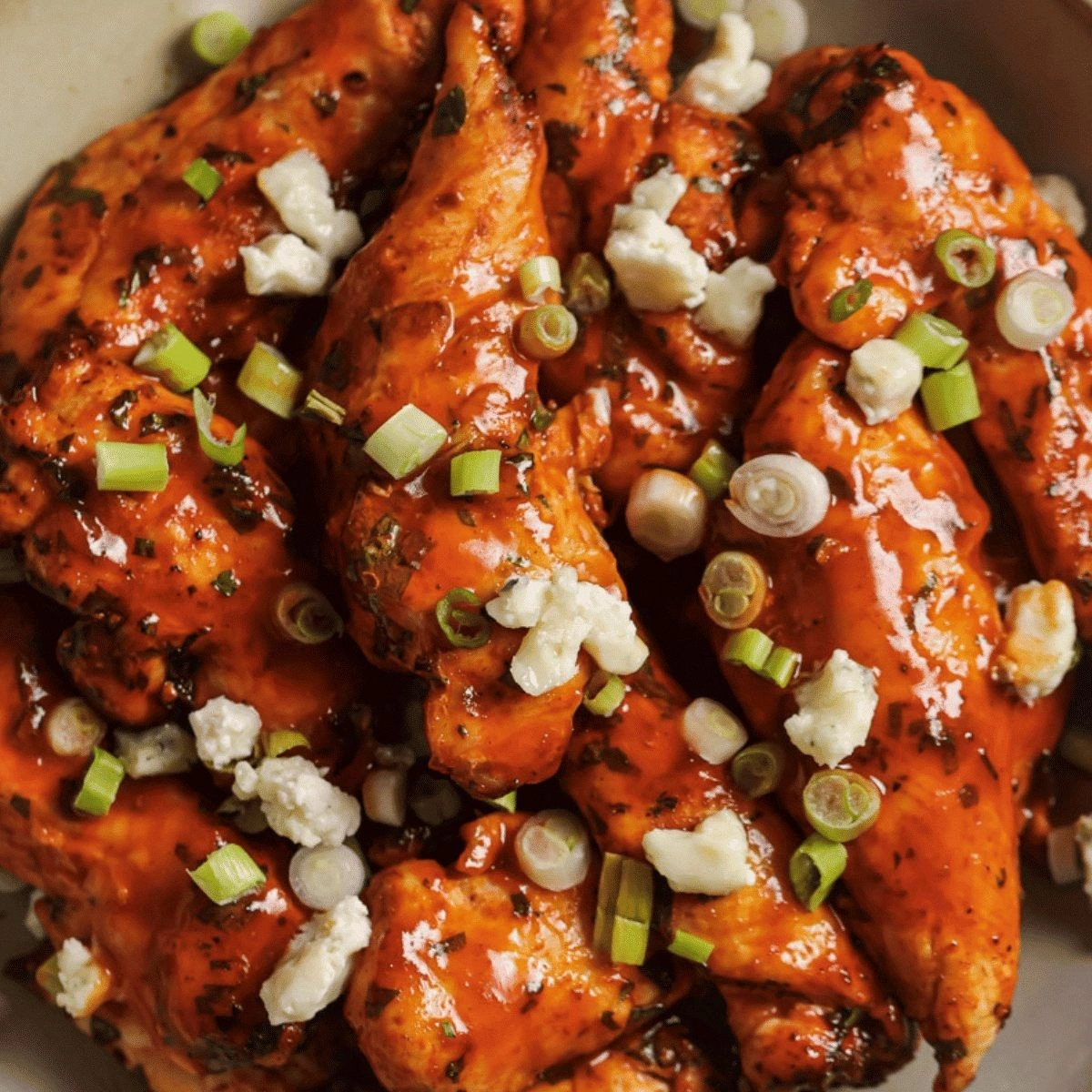 - Once the first batch is done, transfer the tenders to a large bowl. Drizzle the warm sauce over them, tossing gently to coat each piece evenly. The sauce should cling like velvet, creating a glossy, spicy glaze. Add the fresh parsley, sliced green onions, and crumbled blue cheese, mixing lightly. The cheese should melt slightly into pockets, adding creaminess.
