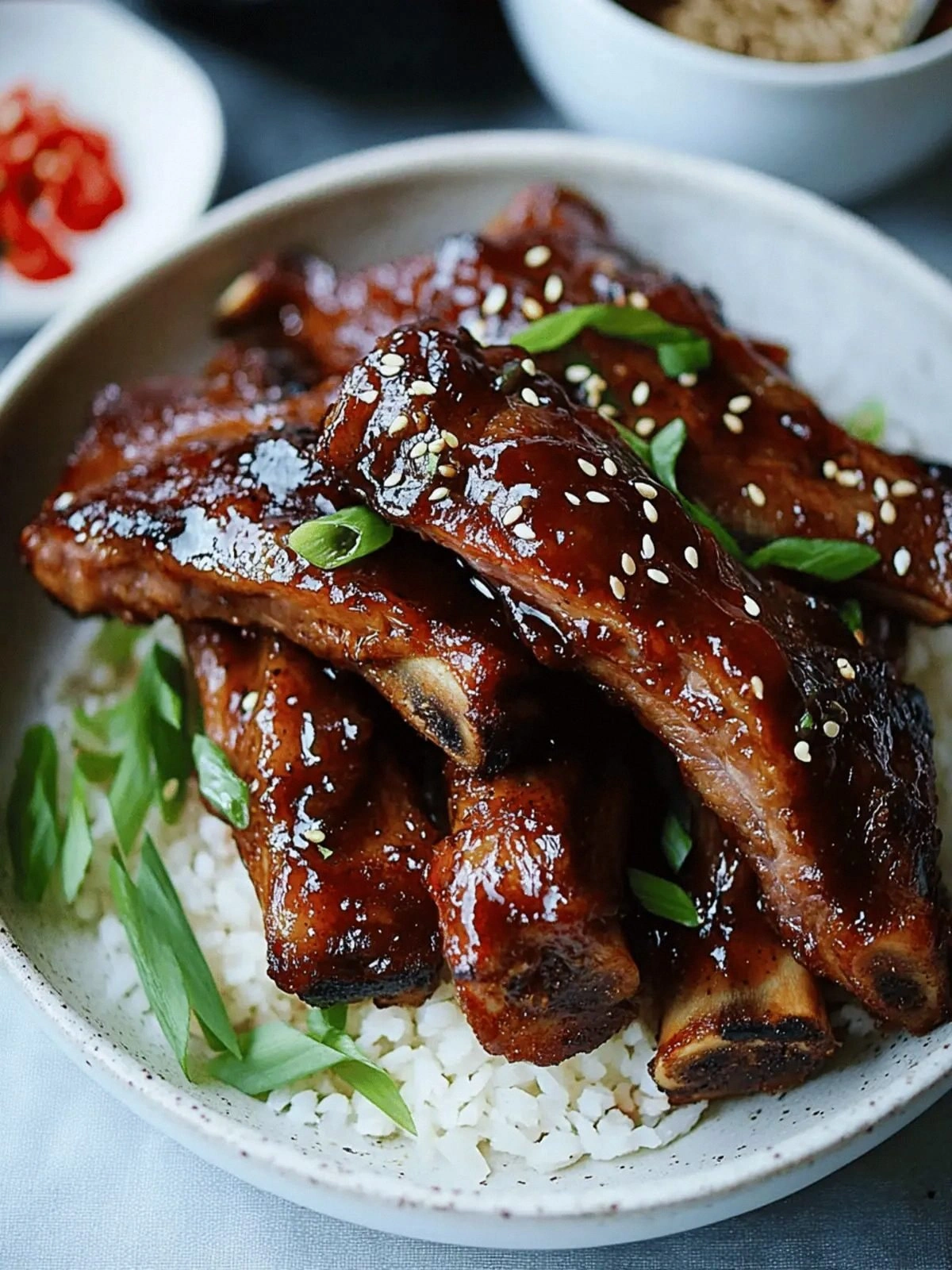 - Rest before serving. Remove the ribs from the skillet and let them rest for 5 minutes. This allows the juices to redistribute, ensuring each bite is juicy. While resting, sprinkle chopped green onion, sliced chilis, and toasted sesame seeds for a fresh finish.